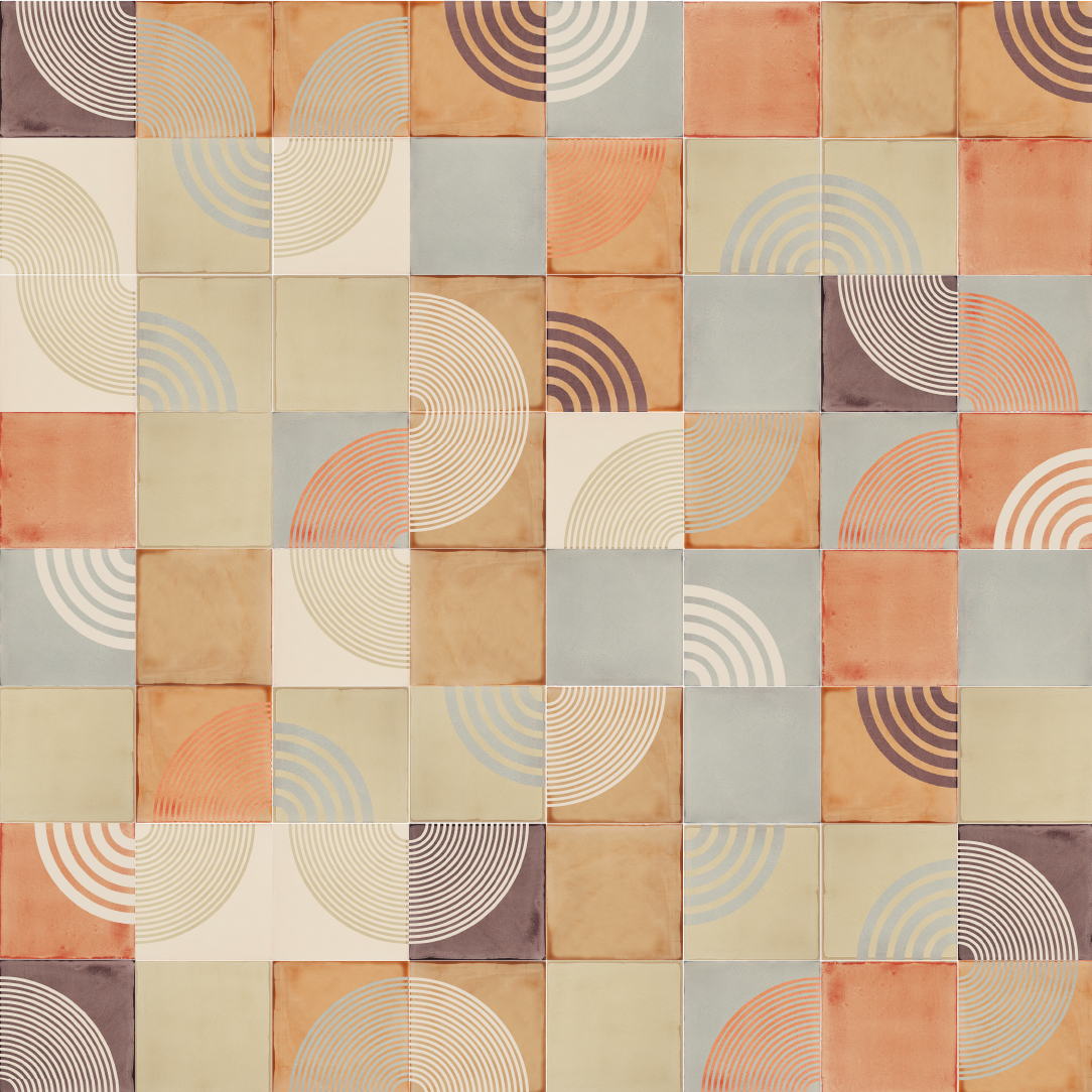 Do you remember drawing circles in the sand as a child? With the tines of a plastic rake you could write your name, draw undulating sets of parallel lines or make elegant, looping patterns that curled and crested and doubled back on themselves, at least until the sea washed them away. Who’s to say it wasn’t art in an early and very pure form? We’ve tried to recapture those swooping, circling lines and the sense of innocent play in this screen-printed ceramic tile design.