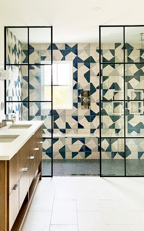 Despite the asymmetrical, angular shapes in this design, there is rolling movement. Perhaps it’s falling rocks or stone age wheels or rolling stones, which, as you know, gather no moss. The tiles R1 and R2, are from our Recubed range and the two similar-but-different shapes are highlighted in each design by two colours, sometime contrasting and sometimes complimentary. But if you fancy different colours, that’s always possible. We handmake all our tiles to order – no warehouses full of tiles just gathering moss!
