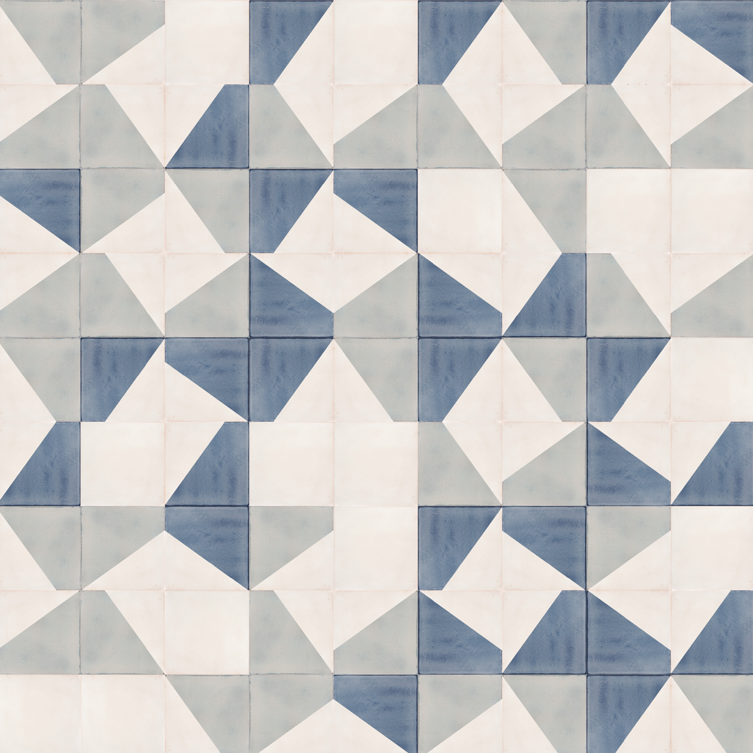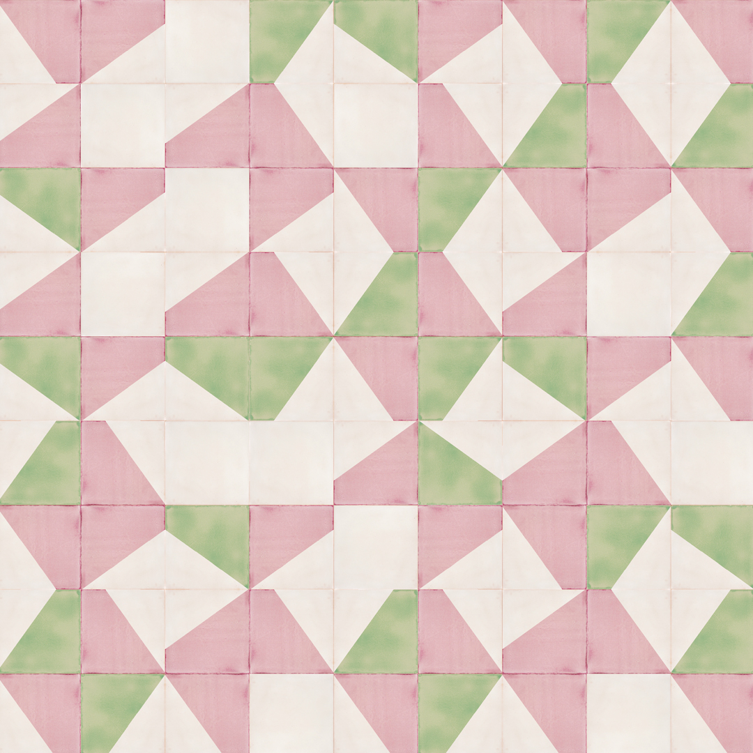 Despite the asymmetrical, angular shapes in this design, there is rolling movement. Perhaps it’s falling rocks or stone age wheels or rolling stones, which, as you know, gather no moss. The tiles R1 and R2, are from our Recubed range and the two similar-but-different shapes are highlighted in each design by two colours, sometime contrasting and sometimes complimentary. But if you fancy different colours, that’s always possible. We handmake all our tiles to order – no warehouses full of tiles just gathering moss!
