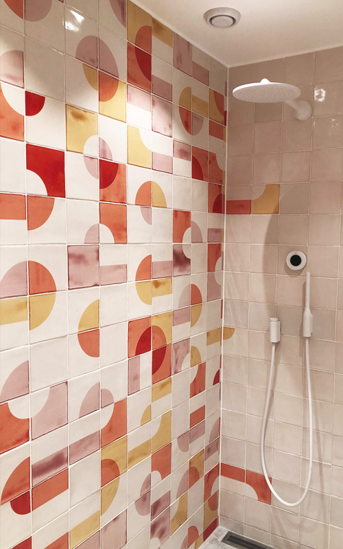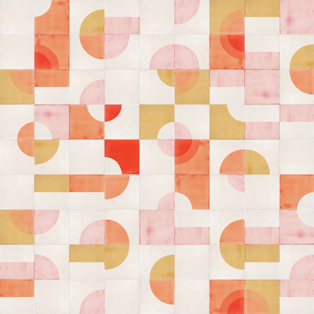 Creating layout designs with the geometric, screen-printed shapes of our tiles can sometimes feel like doing a jigsaw where every piece fits. Instead of searching for the right piece, you search for the right form or colour to make the end result more beautiful. We find that a happy thought and often a joyful process, owing as much to luck (here the design emerged from a random ‘throwing together’ of tiles) as to design skill. Not everything has to be a struggle!