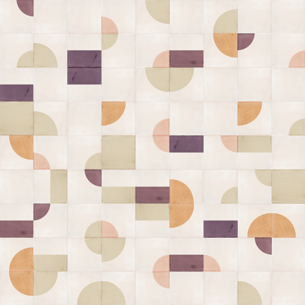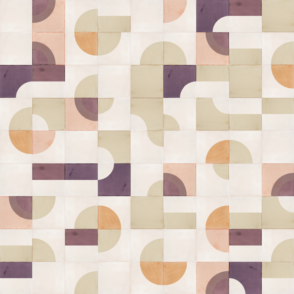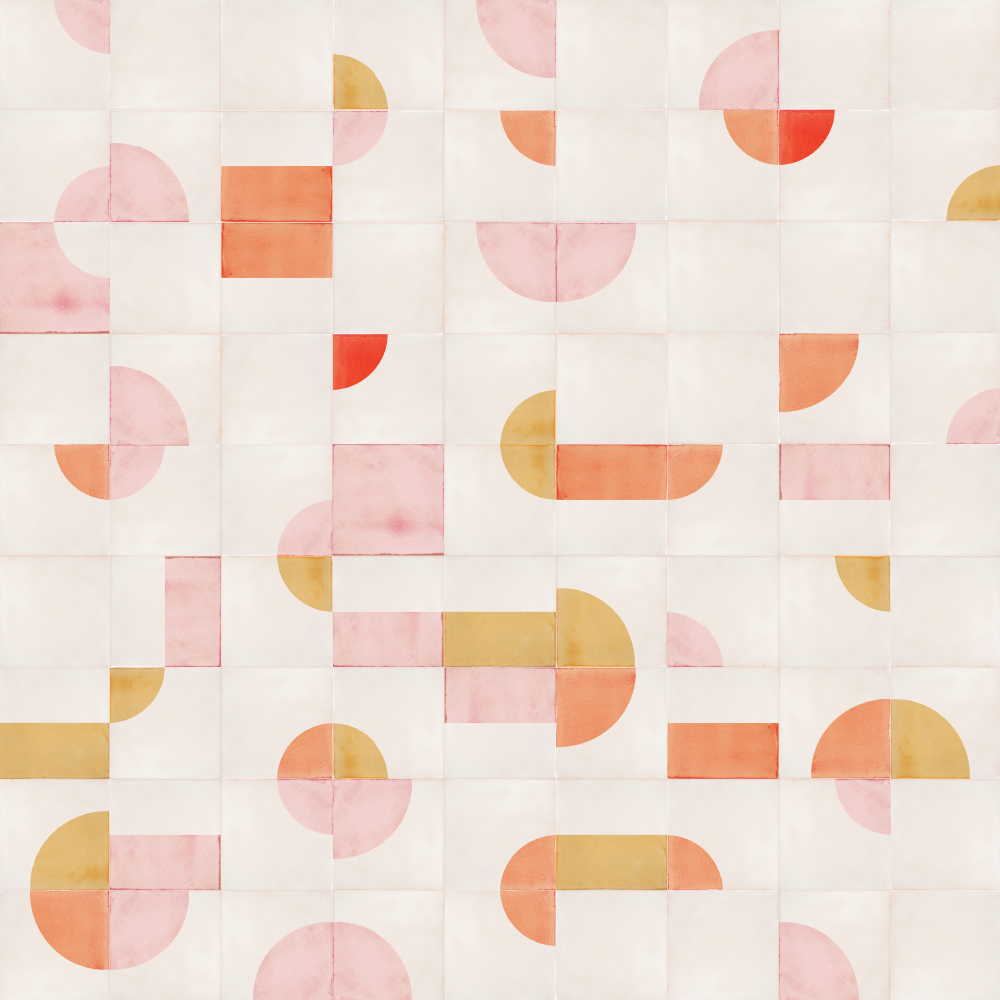 Creating layout designs with the geometric, screen-printed shapes of our tiles can sometimes feel like doing a jigsaw where every piece fits. Instead of searching for the right piece, you search for the right form or colour to make the end result more beautiful. We find that a happy thought and often a joyful process, owing as much to luck (here the design emerged from a random ‘throwing together’ of tiles) as to design skill. Not everything has to be a struggle!