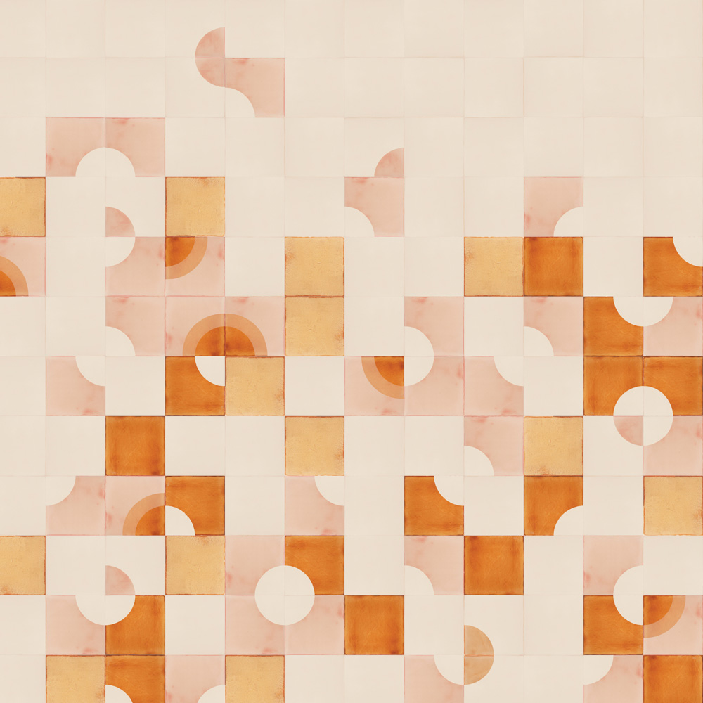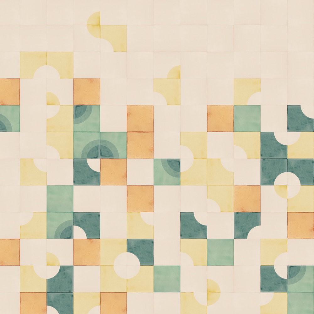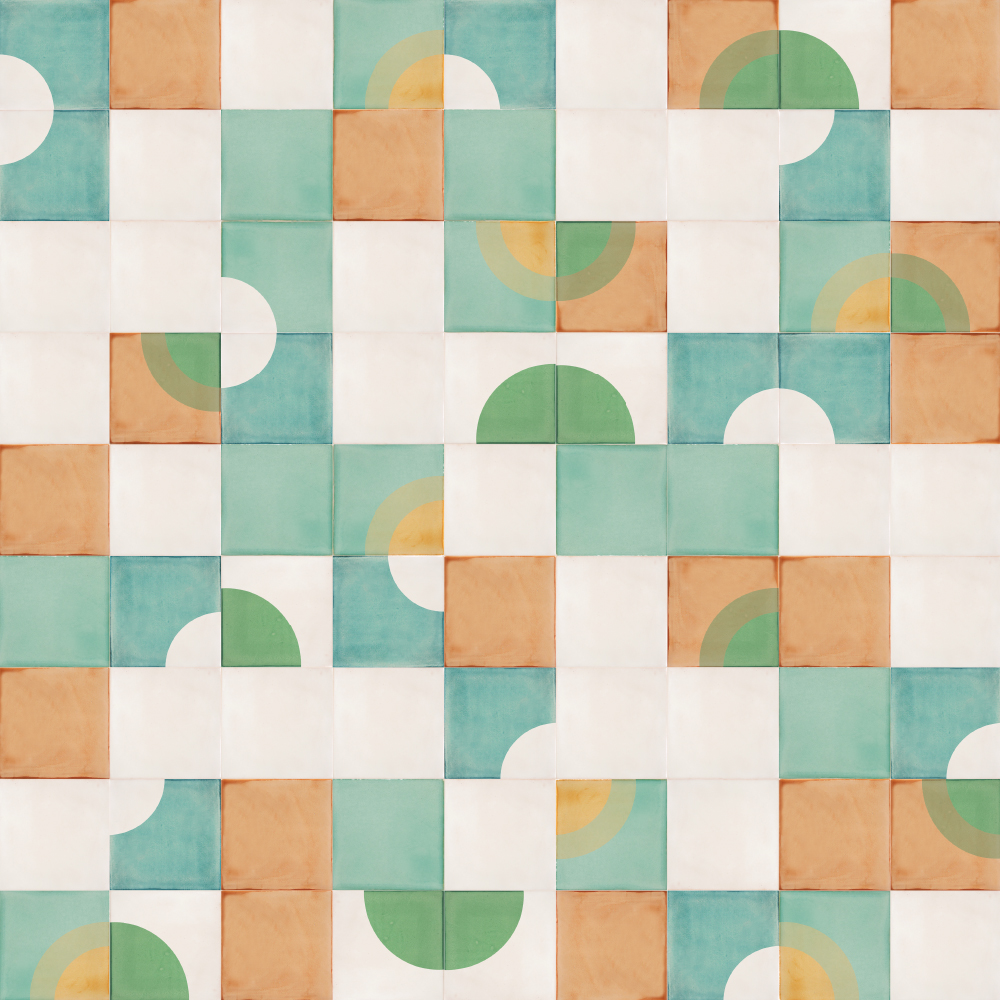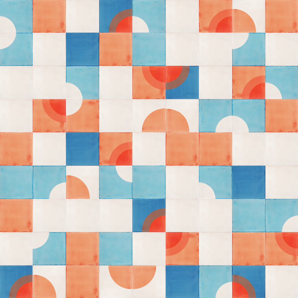No fly posting, the sign tells us on walls and under bridges. Usually ignored, the posters accumulate and over time develop a confused beauty as they overlap, tear and peer through one another. This screen-printed tile design, mixing Sunrise and Quarter Circle tiles, seems to also have different layers which mix, mingle and overlap as they compete for attention.