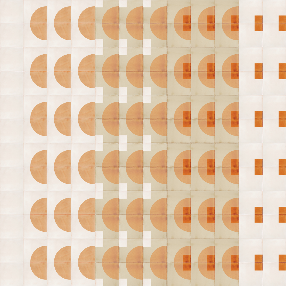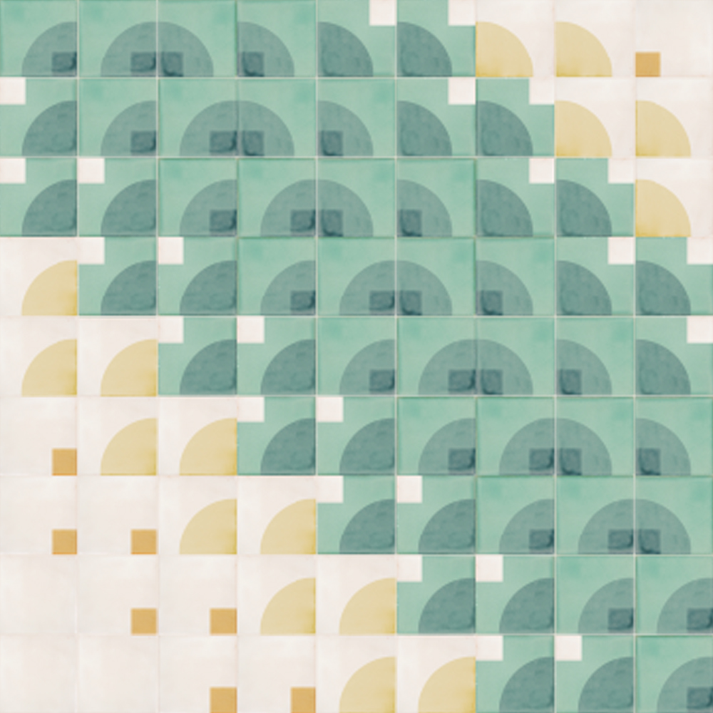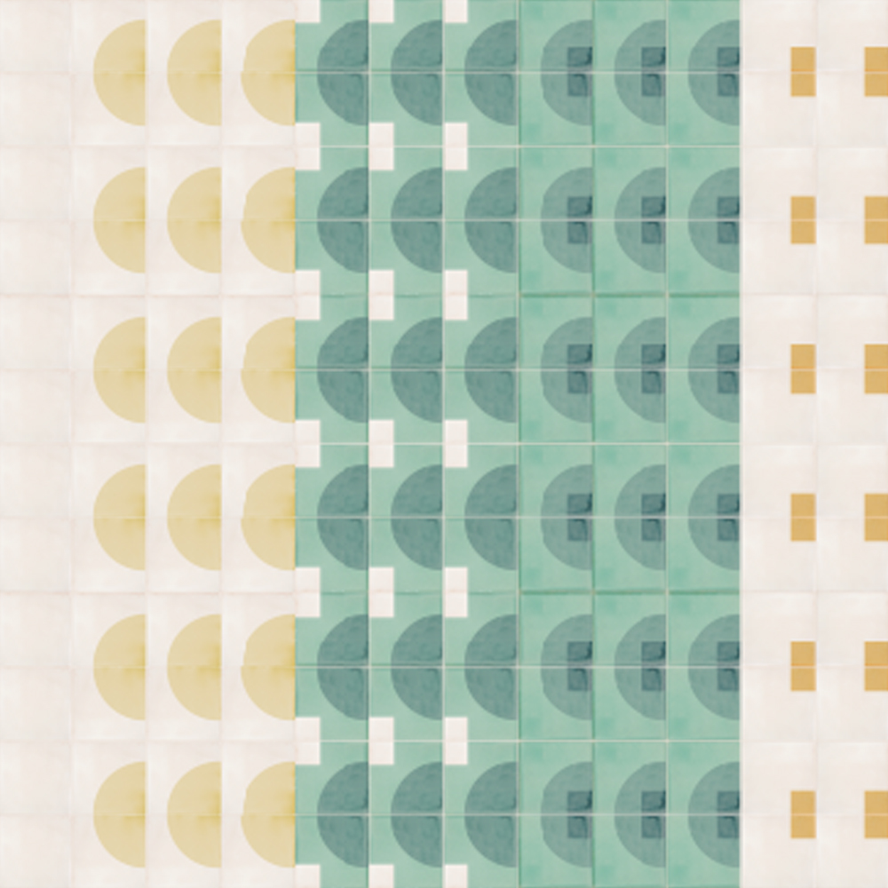 Picture a sound wave and you probably see a sine wave, with its familiar rounded, undulating form. But there are other kinds of sound waves too, with handily descriptive names: triangular waves, saw waves, square waves and more. These two tile layout designs with their mix of single and double printed tiles seem to represent a crescendo of all these sound waves together and it’s hard not to wonder what each design would sound like if you could hear it.