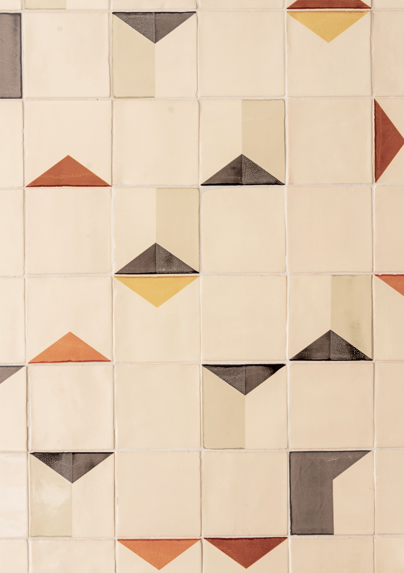 The screen printed tiles mix oranges, reds and browns…