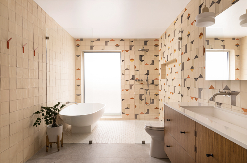 This warm, surprising bathroom has a calm, contemporary feel. The design studio, Iconic Design and Build of Arizona, has used warm wood to match the cream base glaze of the tiles and cleverly combined materials. We were originally contacted with an inspiration photo and we supplied sample tiles and colour chips to match. The client quickly decided that this was the right combination for them and then it was a matter of creating and tweaking a layout design until the client was happy.