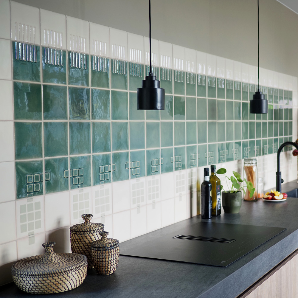 This elegant kitchen backsplash project used Building blocks and Ley lines tiles in Relief and screen-printed form. The only problem was that the planned twenty-six columns of tiles in cream PM06 and green B089 would have came out 4cm short of the edge of the worktop. Impossible! The finishing had to be perfect for this client. Our solution was to custom-make two columns of tiles at either end of the installation that were 2cm wider than the rest. The result was a perfect match!